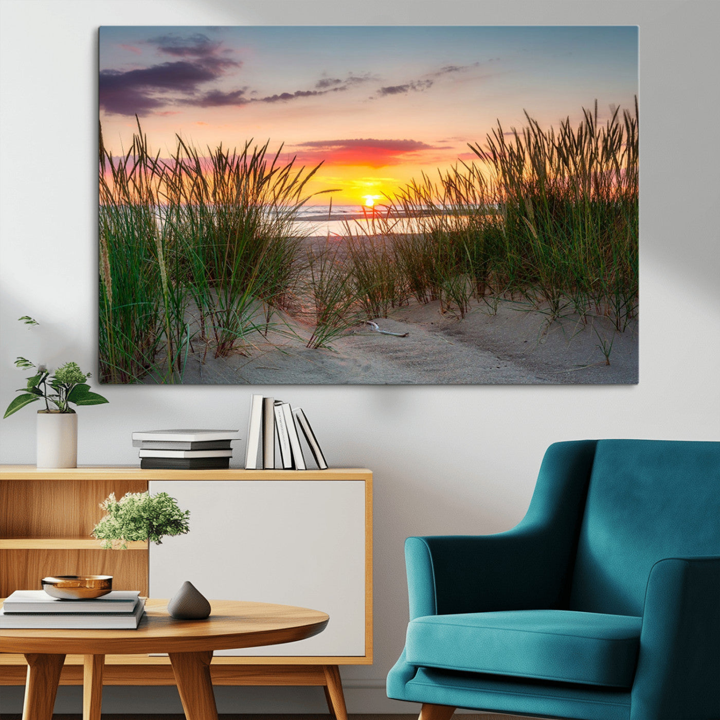 Beach Grass Sunset Wall Art – Coastal Sand Dune Landscape Canvas Print, Ocean View Nature Decor for Living Room or Office Wall