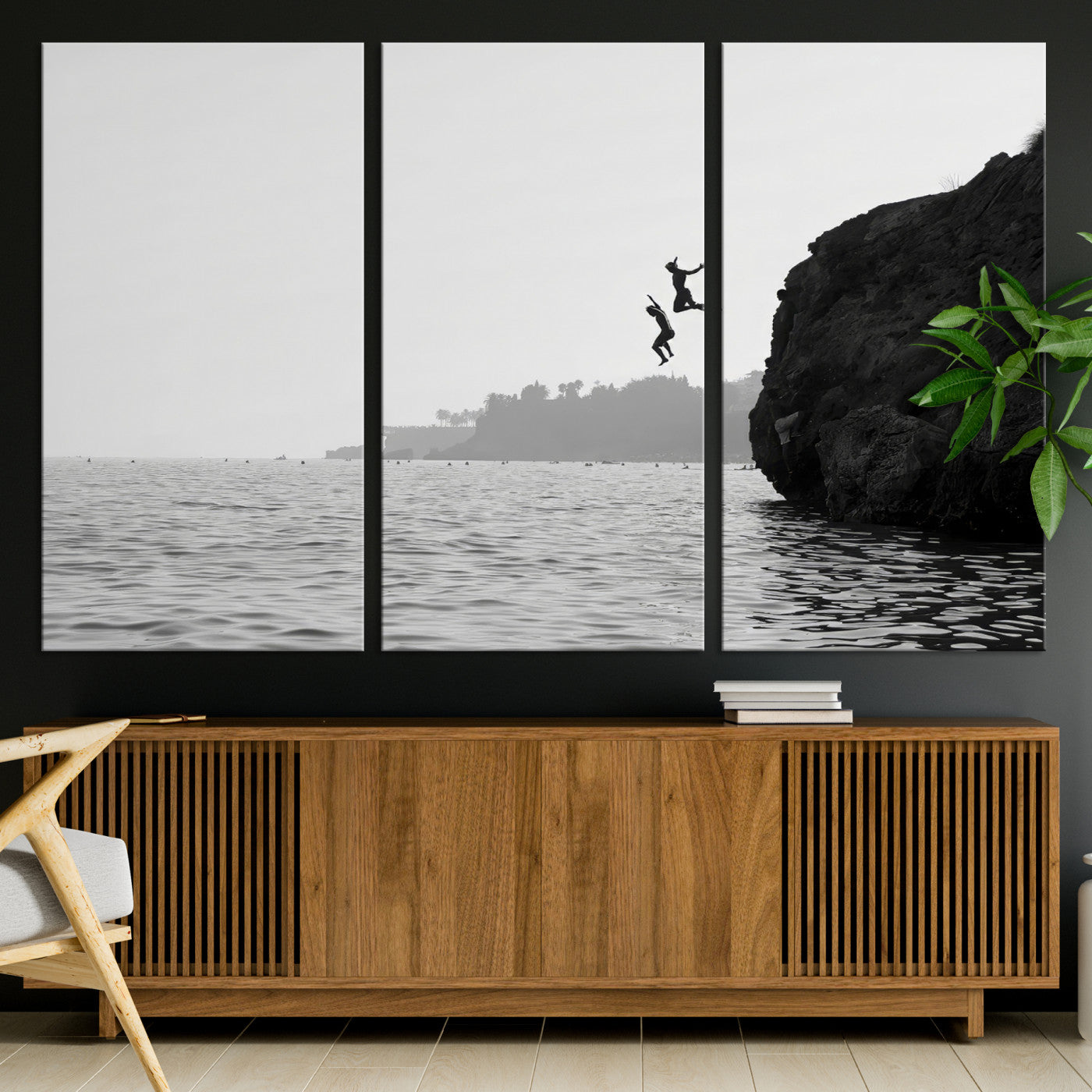 Cliff Jumping Wall Art Canvas Print, Framed Ocean Adventure Art Picture Print, Black White Coast Perfect Modern Coastal Decor
