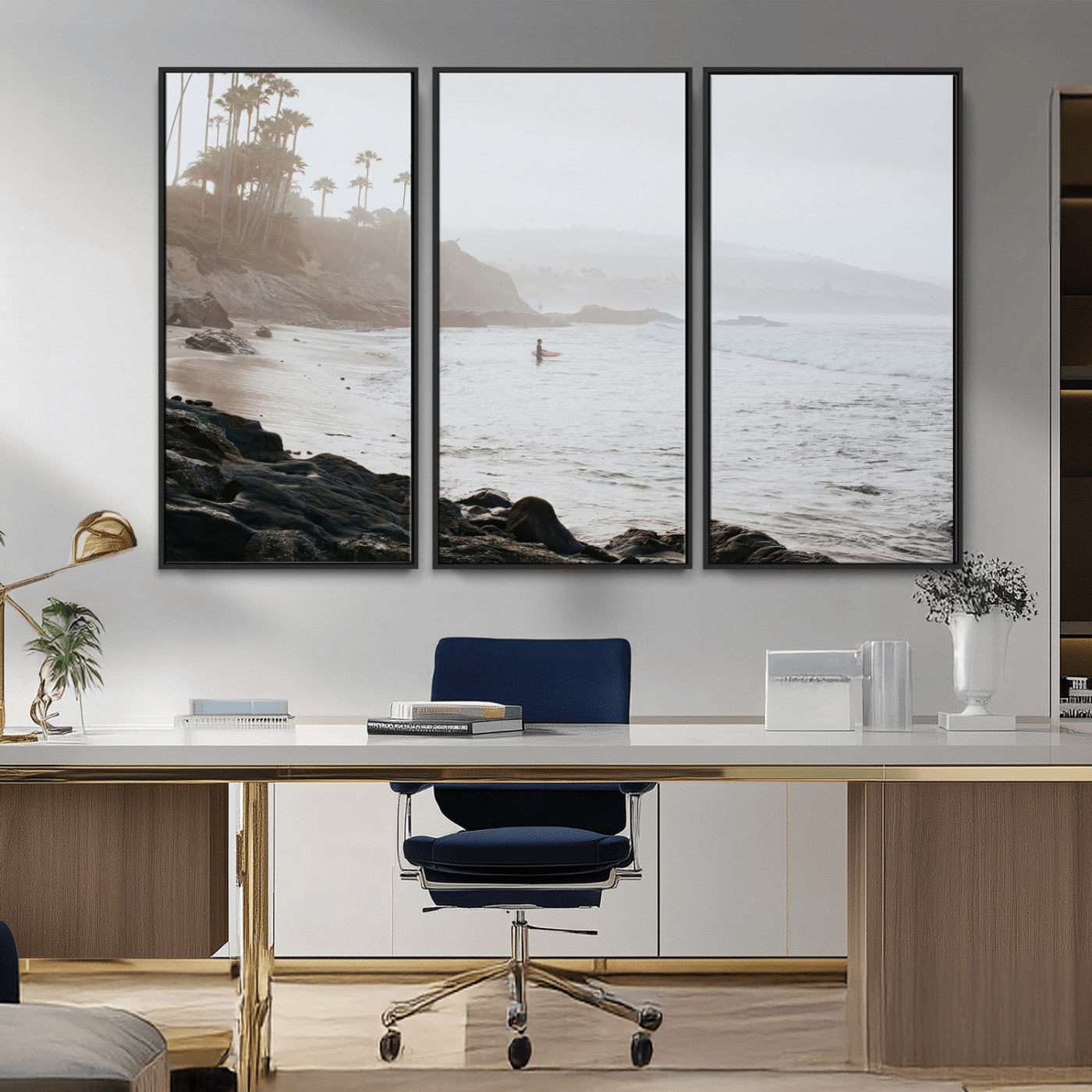 Misty Beach Wall Art Canvas Print, Framed California Surfer Art Picture Print, Coastal Cliff Perfect Coastal Beach Decor Artwork