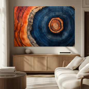 Abstract Tree Ring Wall Art – Vibrant Blue Orange Wood Grain Canvas Print, Rustic Modern Nature Artwork for Living Room, Office,